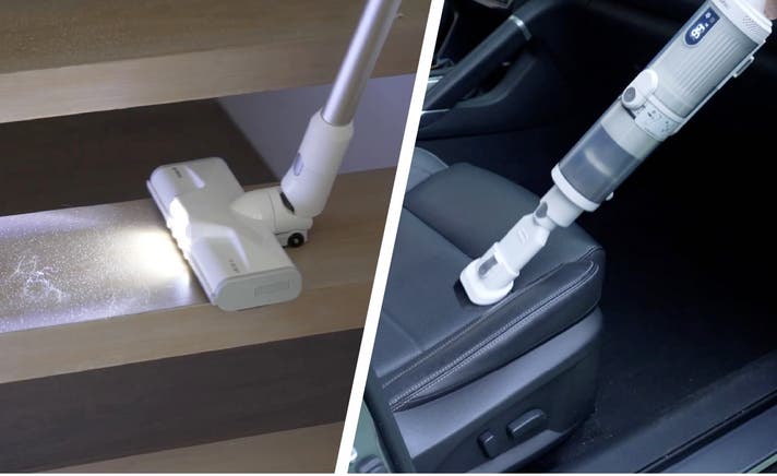 V-SCAN100はスティックタイプのため、床掃除だけでなく、階段や車内の掃除にも使いやすい設計です。本体が軽く、取り回しがしやすいため、段差のある階段や、シート周り・足元などの狭い車内でも、無理なく動かせます。