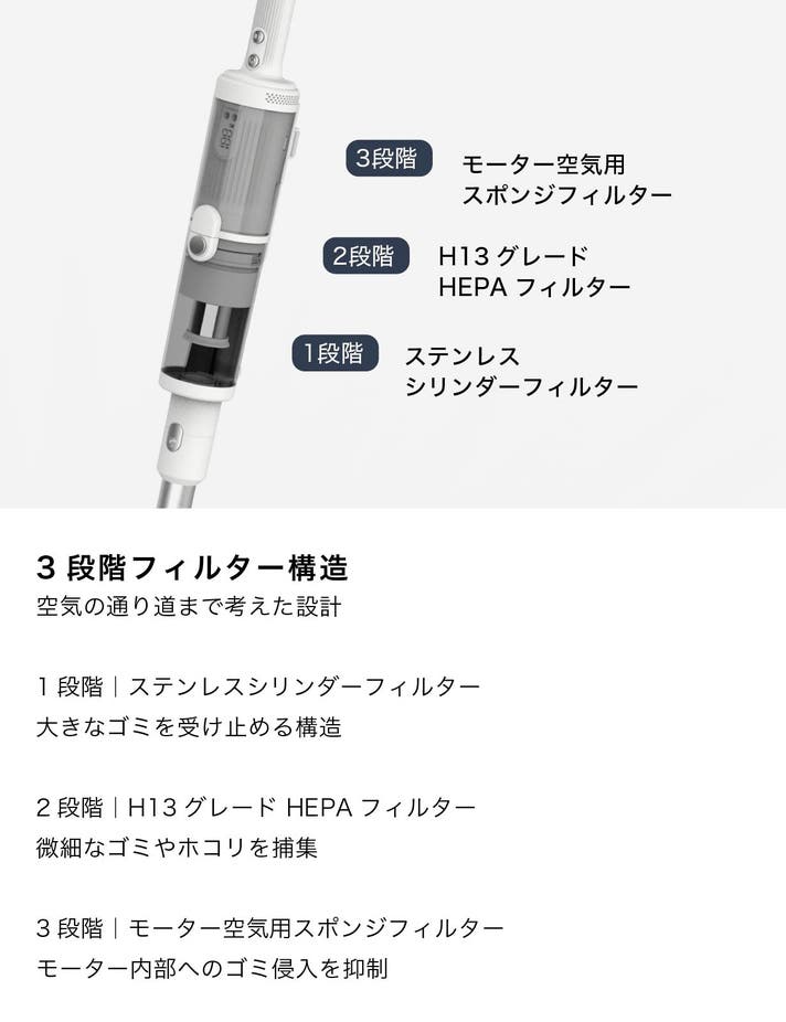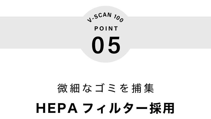 V-SCAN100は、吸い込んだゴミを段階的に処理する3段階フィルター構造を採用しています。H13グレードのHEPAフィルターを含む構成により、掃除中に取り込んだ微細なゴミやホコリをフィルター内部に留めやすい設計です。床をきれいにするだけでなく、掃除中の空気の流れにも配慮した構造を目指しました。