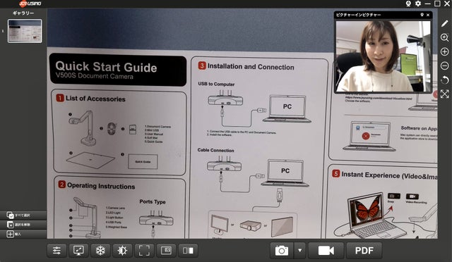 ピクチャー イン ピクチャー機能を使う事で、パソコン内蔵のカメラ映像とV500S-4Kの映像を同時に、収録保存する事ができます。V500S-4Kの4K高精細カメラで書類または物体を映しながらパソコンカメラに向かって説明を行うという使い方ができます。