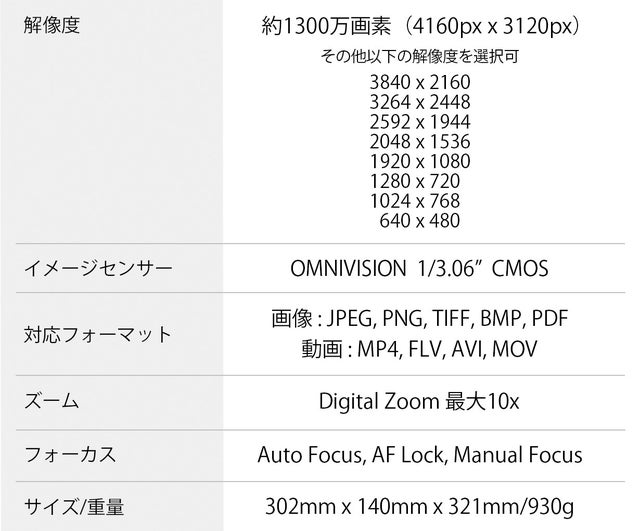 OMNIVISION社製 1/3.06インチ、1300万画素(13MP) CMOSセンサーを搭載 ! 被写体を高精細に映し出し効果的な演出に貢献します。また、Zoom/Skypeなどビデオ会議の際、4K/HDカメラとしてお使い頂けます。