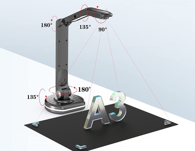 以下の様に、5ケ所において回転、角度を変えられるアームを搭載。A3サイズの被写体をあらゆる角度、距離で捉える事ができます。