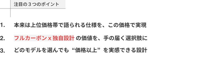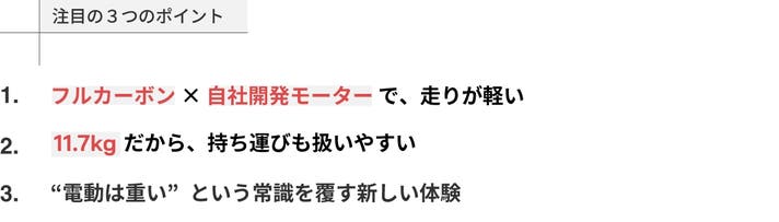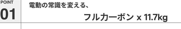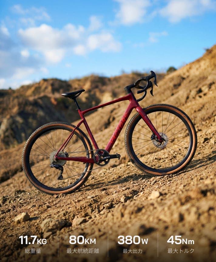 さらに、カーボンフレームを軸に、タイヤやホイール、ネジに至る細部まで軽量化を徹底。その積み重ねが、フルカーボン×11.7kg という、電動として異例の軽さを実現しています。