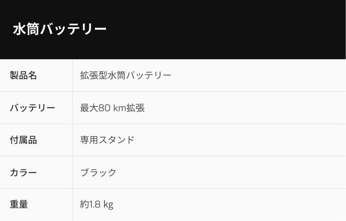 航続距離|最大 80km (※拡張水筒バッテリー使用時 160km)