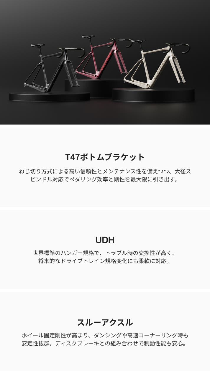 T47、UDH、スルーアクスルなど最新スポーツバイク規格を採用し、剛性分布や振動吸収を最適化。ロードバイクと同じQファクターを実現。