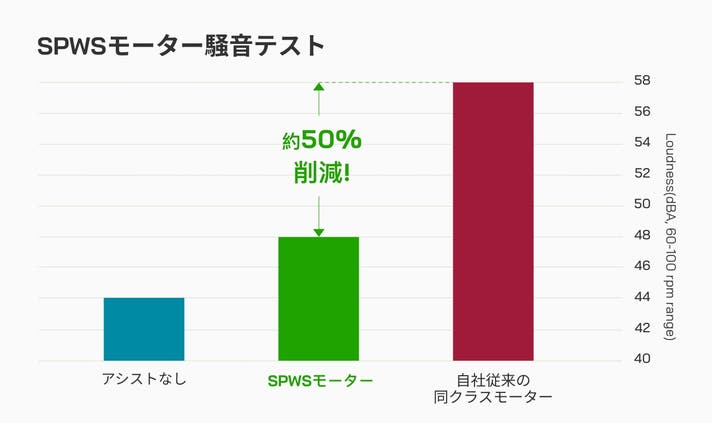 ギヤ加工精度の向上、磁気設計、制御アルゴリズムの最適化により、自社従来の同クラスモーターと比較して騒音性が約50%低減(※2025年:自社試験データ)。高出力域でもノイズを抑え、騒音かつ高効率な駆動を実現しています。