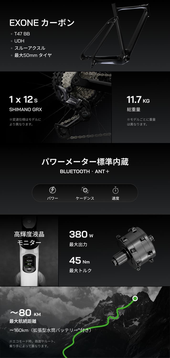 EX ONE は、電動らしさを感じさせない洗練された都会的な佇まいに、グラベルらしい“外に走り出したくなるワクワク感” を融合させました。街でも自然でも、どこにでも馴染むデザインです。