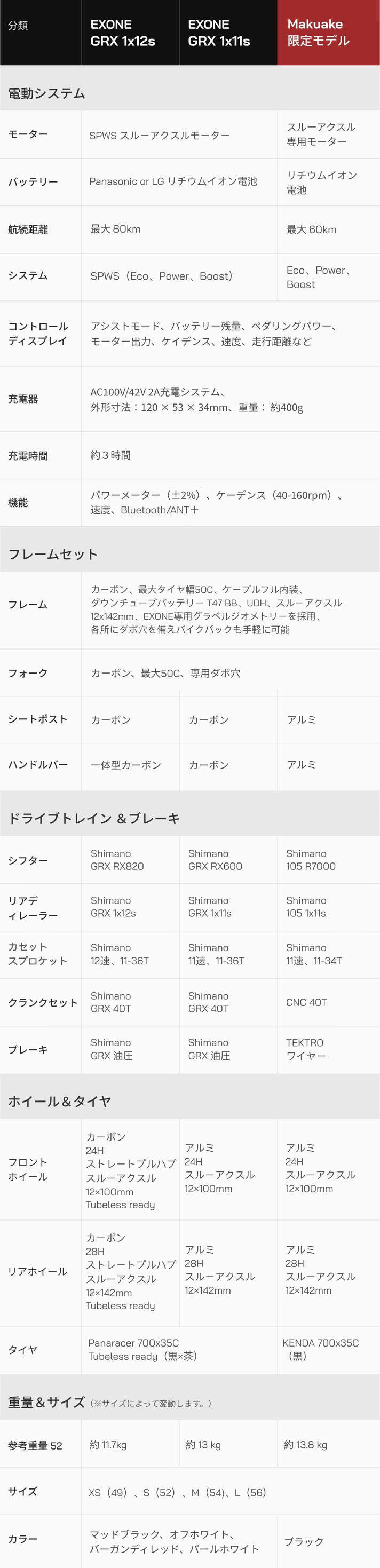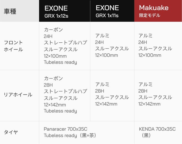 ※EXONE GRX 1x11sとMakukae限定モデルのリムはチューブレス非対応です。