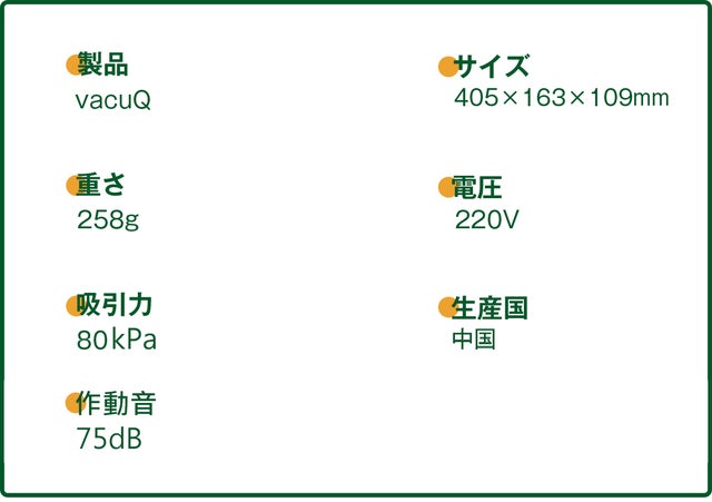 「vacuQ」なら、80kPaの強力吸引で袋の中の余分な空気を吸い出し、しっかり真空パックできます。
