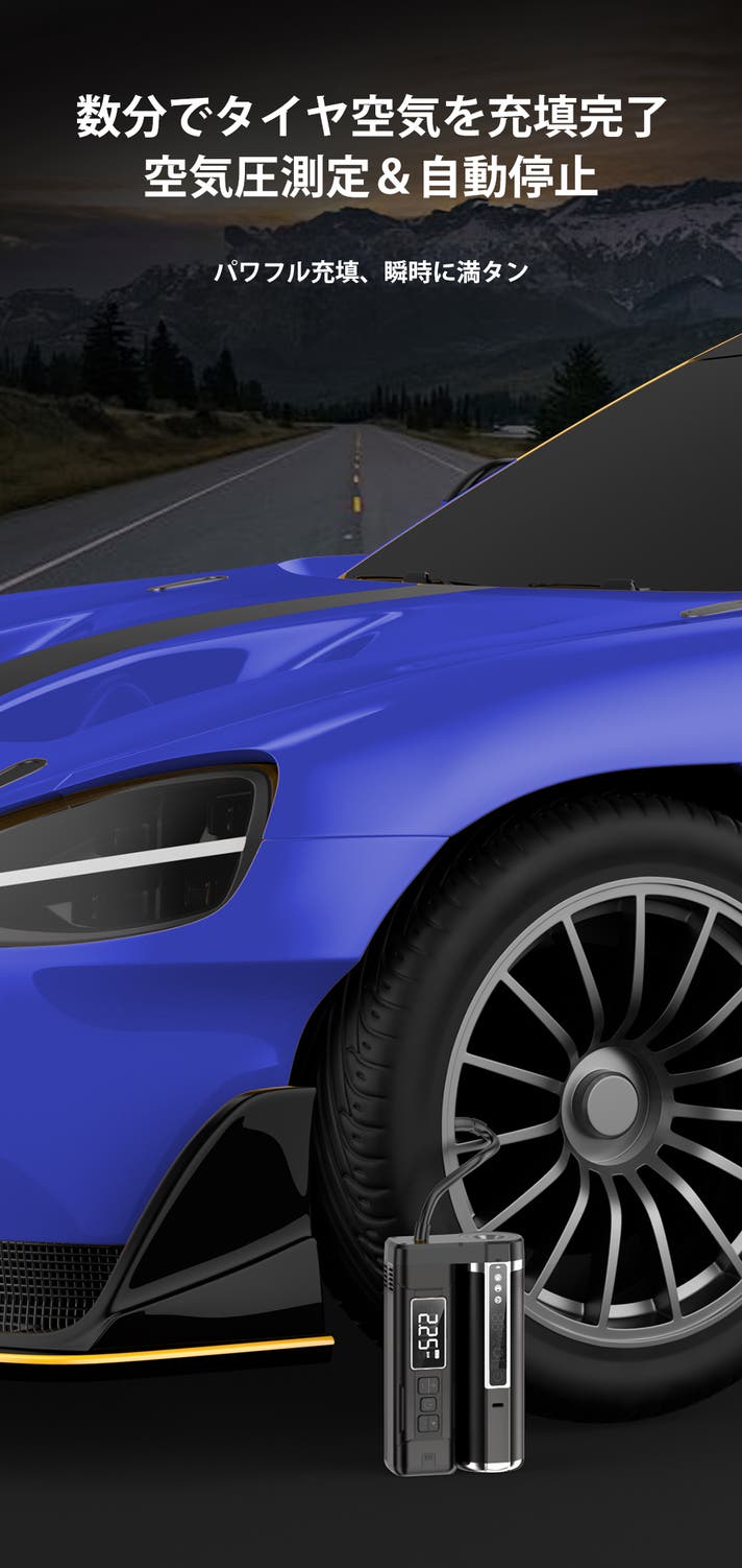 現在の空気圧も検知でき、設定した目標値まで自動で加圧します。目標値に達すると自動停止するため、入れすぎの心配もありません。さらに、ポンプ部分にはライトを内蔵し、夜間や暗い場所でも安心して作業が行えます。アウトドアやドライブ中、タイヤの空気が急に減ってもこれ一台で即対応!