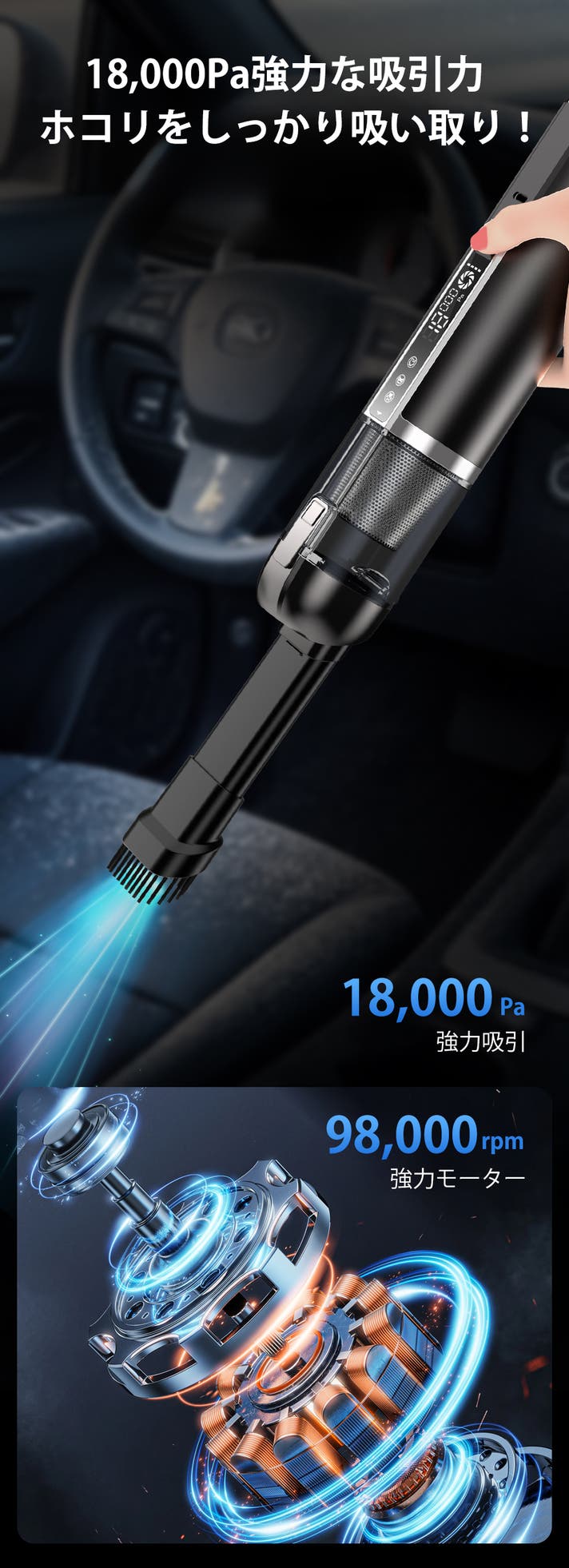 - 多機能でも性能妥協ナシ!98,000回転モーターで18,000Pa吸引力&25m/s送風を実現
