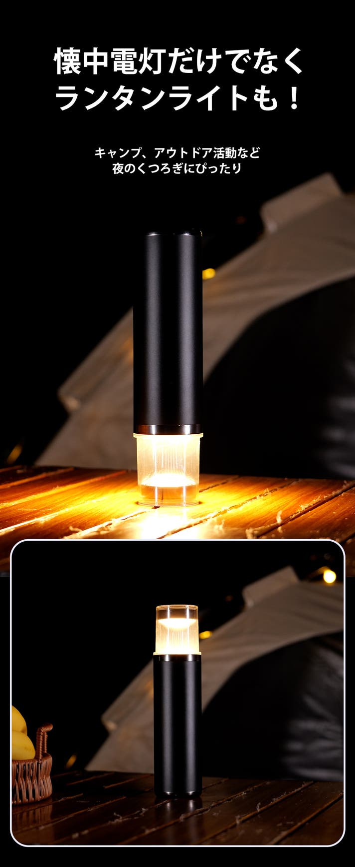ランタンモードに切り替えれば、柔らかな光が空間を包み込み、アウトドアでの食事や語らいのひとときを穏やかに照らします。テント内の照明やベランダでの夜のくつろぎにもぴったり。