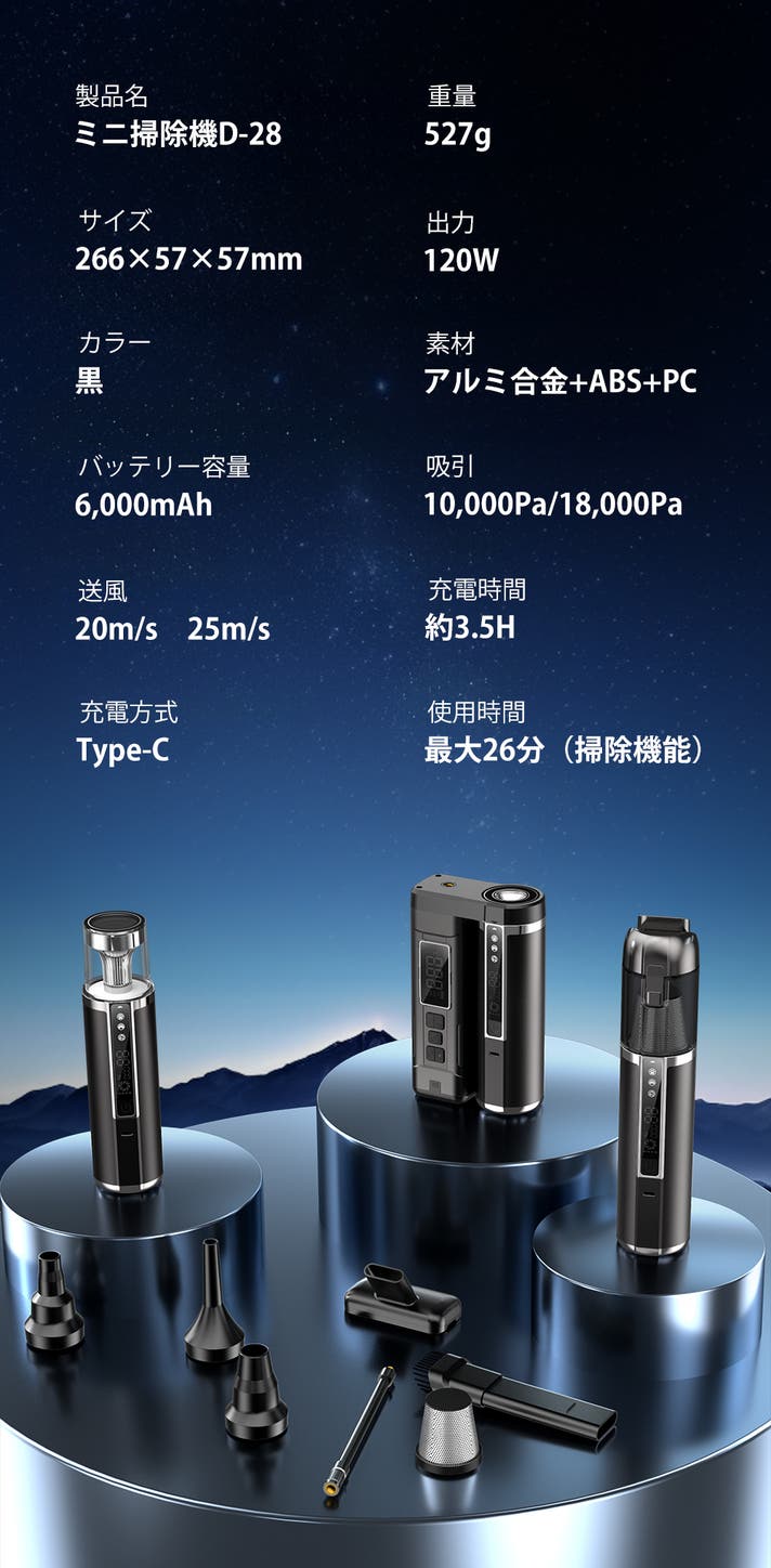 これまで掃除機は“吸う”だけの道具でしたが、私たちはそこに“もっと自由な使い方”を見出したいと考えました。そこで誕生したのが、多機能でありながら性能に一切妥協しないミニ掃除機D-28です。吸引・送風・空気入れ・照明という4つの機能をひとつにまとめ、従来の掃除機の枠を超えた新しい形を実現しました。この1台があれば、家でも車でもアウトドアでも、さまざまなシーンで快適に対応できます。D-28は、単なる便利グッズではなく、「掃除機の進化形」として、私たちの“挑戦”の答えを形にした製品です。