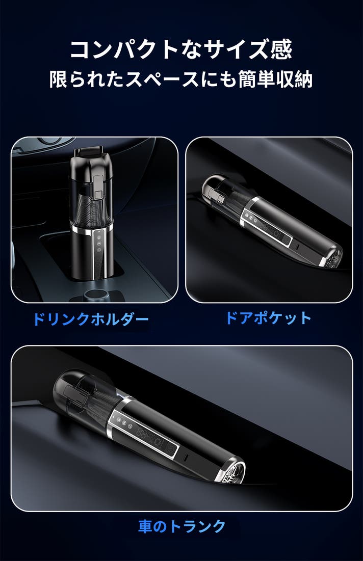 サイズはわずか266×57×57mm。小さくスリムな設計で、持ち運びも収納もラクラク。車のドリンクホルダーやドアポケットなどの狭い隙間にもすっぽり収まり、いつでもどこでもスマートに使えます。