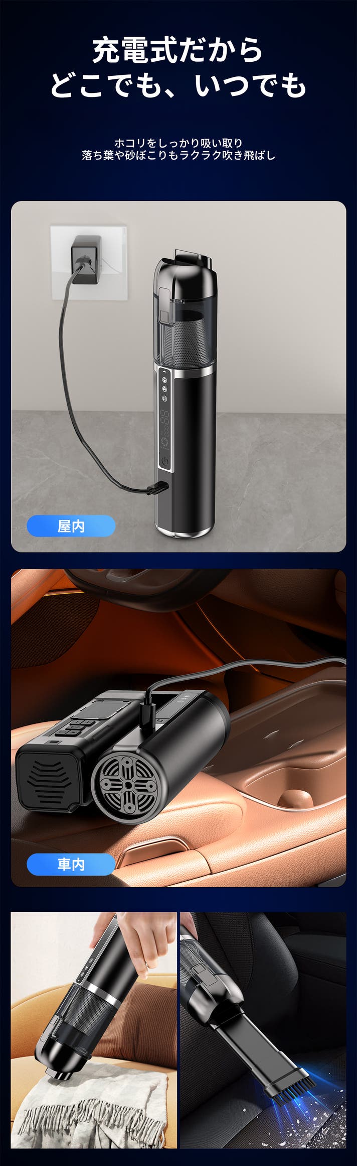 - 掃除、タイヤに空気入れ、エアダスター、照明まで、多彩な機能で日常の困りごとを一気に解決!