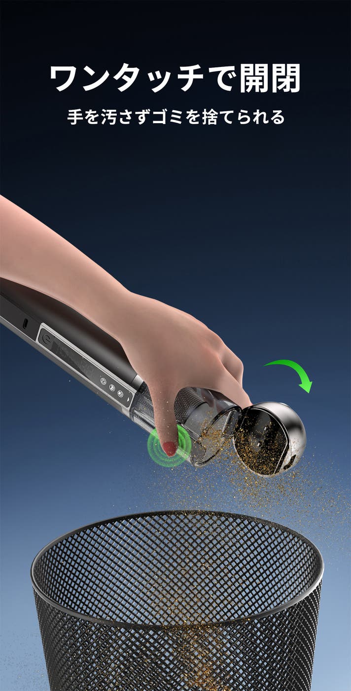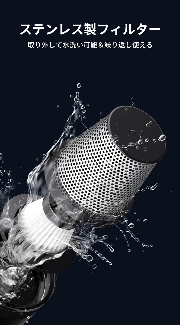 ダストボックスはワンタッチで開閉できるカチッと構造を採用し、手を汚さずゴミを捨てられる設計です。内部のフィルターはステンレス製で、取り外して水洗い可能&繰り返し使えるので、いつでも清潔に保てて経済的です。