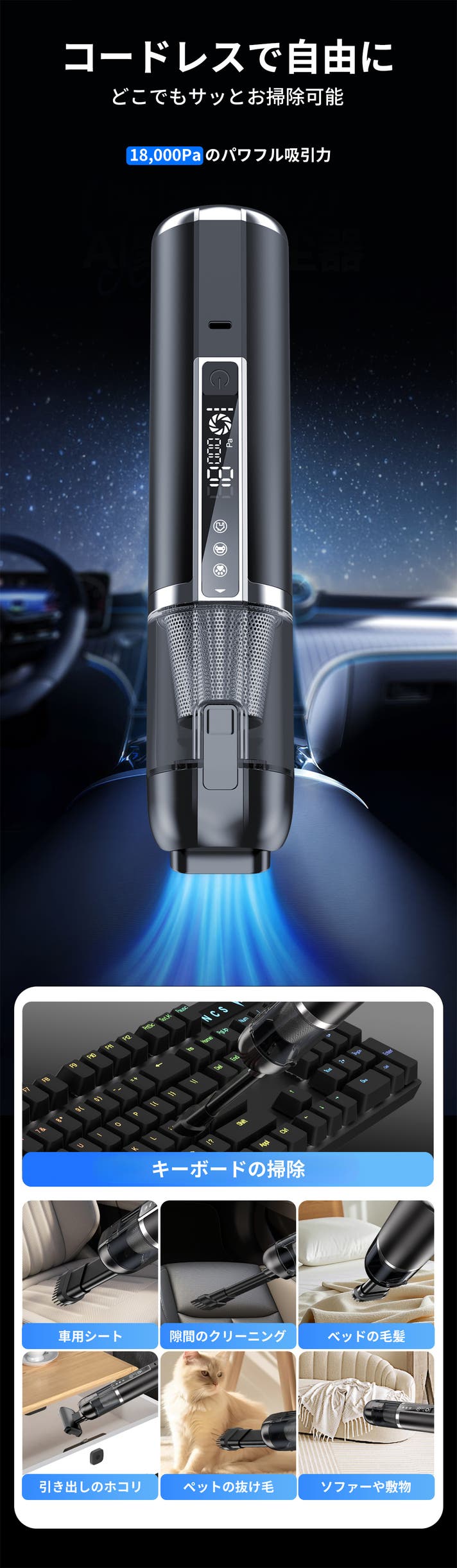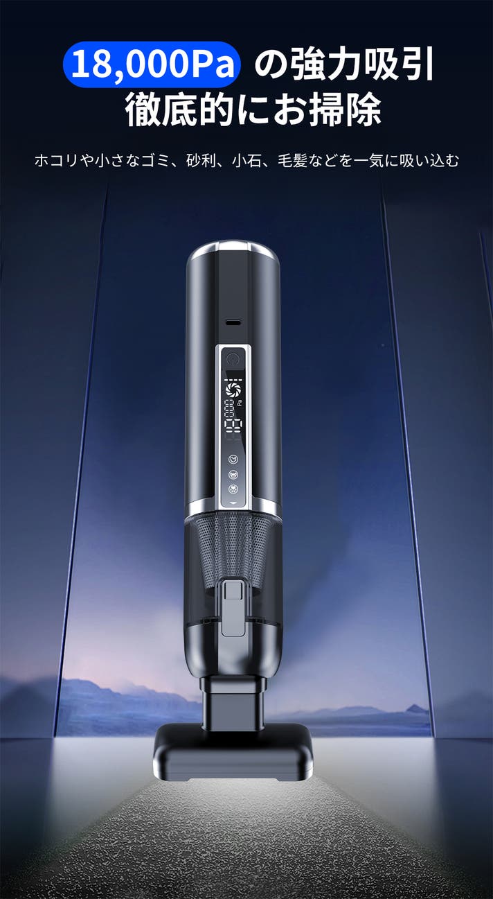 最大18,000Paの吸引力を維持しつつ、エアダスター・空気入れ・照明といった新しい機能を融合。