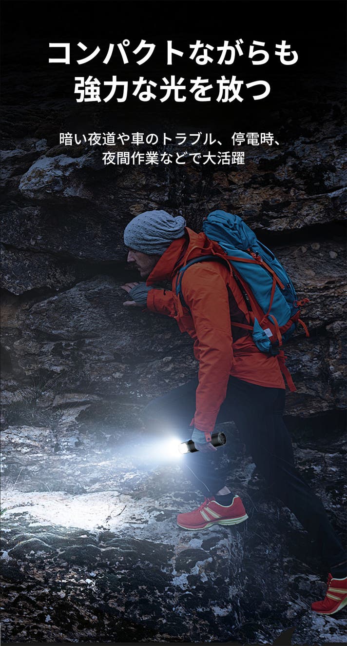 専用のライトモジュールを装着すれば、本体が懐中電灯に変身!暗い夜道での作業や、車のトラブル時、停電時など、いざという時に頼れる心強い存在です。コンパクトながらも強力な光を放ち、足元や手元をしっかり照らします。ドライブ中に突然のタイヤ交換が必要になったときや、夜間のキャンプで道具を探すときにも大活躍。