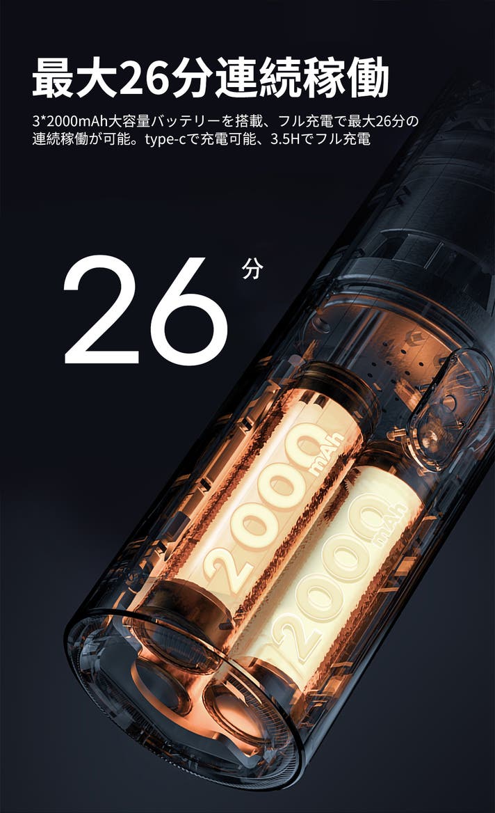 コンパクトなボディに、6,000mAhの大容量バッテリーを搭載しています。吸引/送風モードで最大26分間の連続使用が可能で、日常の掃除や車内清掃など、ほとんどのシーンをしっかりカバーします。充電はType-Cポートに対応し、屋内でも車内でも手軽に充電可能です。