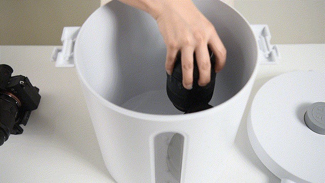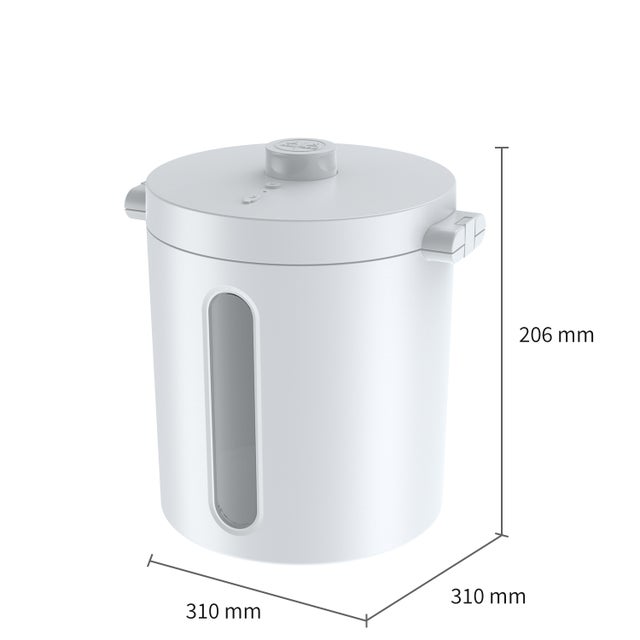 ボタンを押すだけで、電動で内部の空気を抜き、真空状態を維持します。ポンプ等は一切不要です。完全に密閉された上に高圧力が掛かるので、外部の湿気や虫の侵入を遮断します。蓋を開けるときはボタンを押して真空を解除、簡単に操作できるので、どなたにも気軽にお使いいただけます。