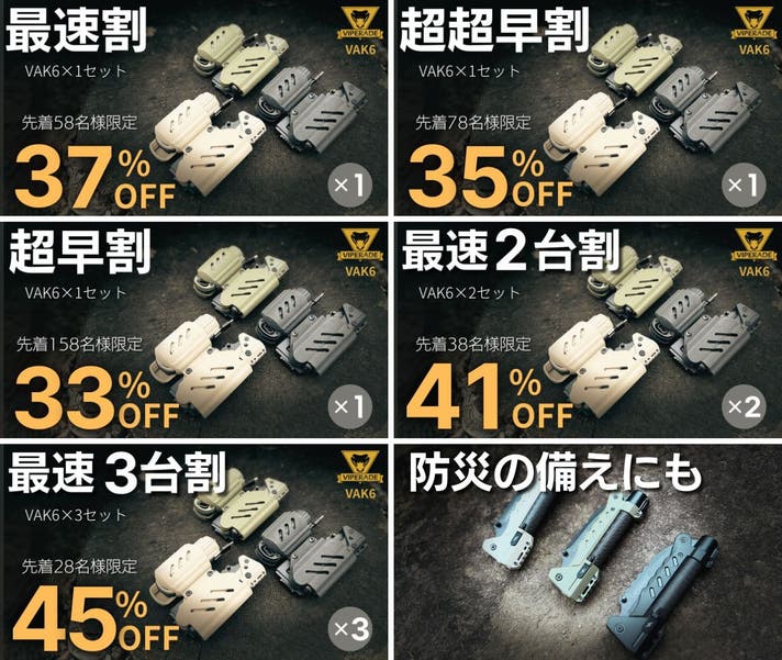 ※リターン品の配送が完了するまで、VIPERADE 「VAK6」の日本における独占販売権を有する正規代理店です。 並行輸入品が発生する可能性がございますが、並行輸入品には正規代理店による製品サポートを受けることができません。また、正規代理店を通じて購入することで、日本国内での流通に必要な各種認証の取得や、関税の適切な処理が担保されます。 ※注意事項 本製品は正当な理由(アウトドア・キャンプ・登山・防災など)がある場合を除き、公共の場所や車内での携帯は禁止されています。 正当な理由なく携帯した場合、銃刀法違反となる可能性がございますのでご注意ください。 ※一部国内に類似品が出回っている場合がございます。弊社では他社の類似品に関してのお問い合わせには対応できませんのでご了承ください。 ※本文中に記載させていただいたスケジュールは、あくまでプロジェクト公開時点の予定です。応援購入の性質上、配送遅延のおそれがございます。 ※原則として、配送遅延に伴う応援購入のキャンセルはできませんが、リターン配送予定月から3ヵ月を超えた場合には、希望者に限りキャンセルにて対応させていただきます。 ※製品は既に完成していますが、生産状況・天候・配送問題などで、輸送が遅延する可能性がございますので、ご留意ください。 ※使用感などに関しては、感じ方に個人差が予想される製品でございます。そのため、使用感等に関する返品・返金はお受けいたしかねます。 ※本プロジェクトを通して想定を上回る皆様から応援を頂き、現在進めている環境から量産体制を更に整えることができた場合、正規販売価格が販売予定価格より下がる可能性もございます。 ※並行輸入品、類似品が発生する可能性があります。防ぐことができない可能性がある点、ご了承願います。 ・プロジェクトの属性:輸入商品 ・代理店によるサポート:代理店による日本語カスタマー対応 ・プロジェクト実行者(国):日本 ・製品者(国):中国 ・製造者(国):中国