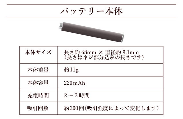 バッテリー容量220mAh。フル充電の状態でのアトマイザーの吸引回数は約200回(※1)、カートリッジはリキッド1mlの充填での吸引回数は約300回(※2)です。