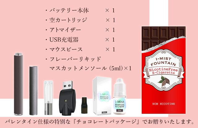 商品はチョコレートパッケージをデザインしたバレンタイン仕様のスペシャルボックスでお届けいたします!フレーバーリキッドはマスカットメンソール(5ml×1本)が付いており、届いたその日からお使いいただける便利なセットです。