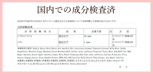 ニコチンやジエチレングリコールという毒性があるとされる成分の分析表です。どちらも検出されていません。