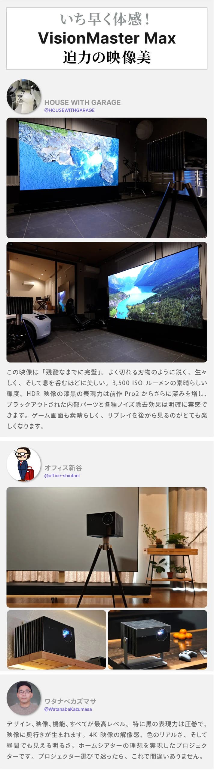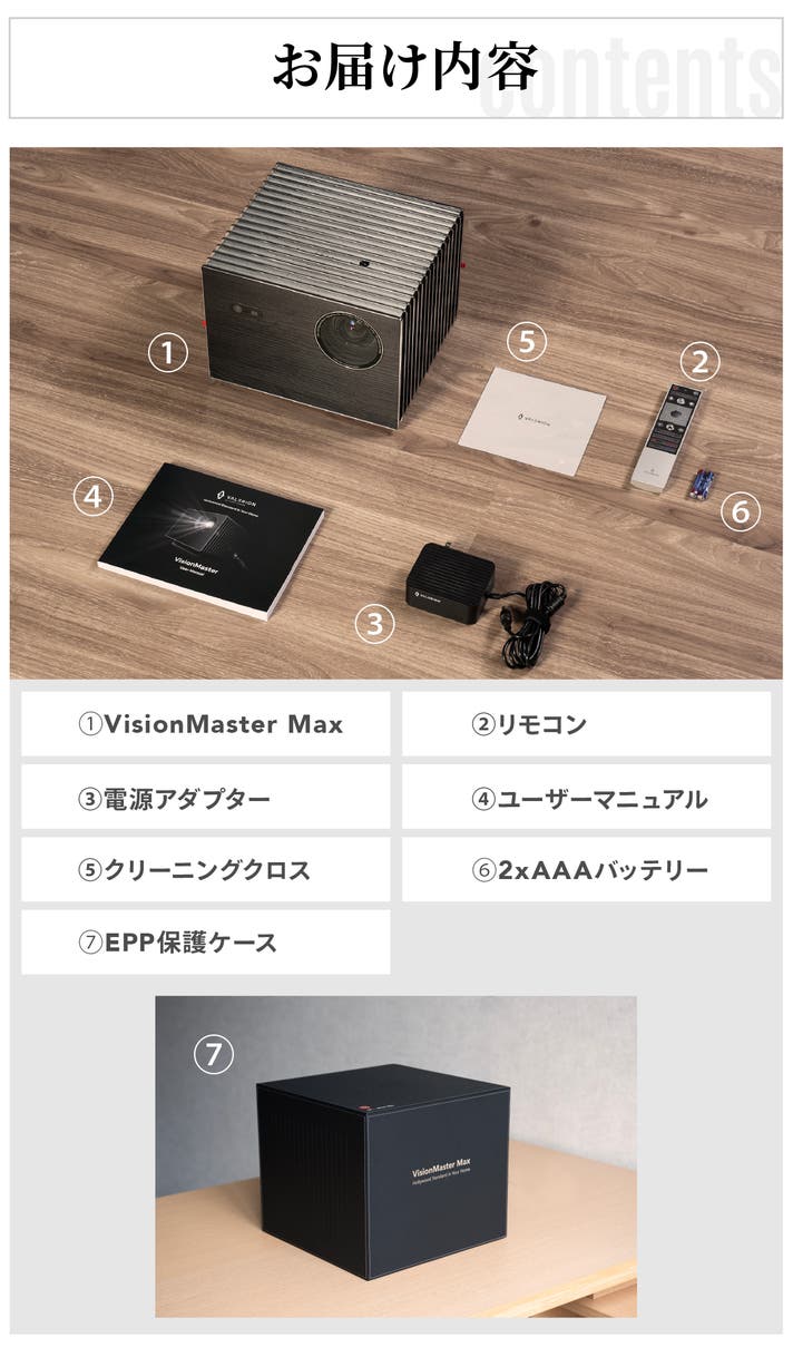A. VisionMaster Max は、RGB純三色レーザーによる圧倒的な色表現、Provision Engine™ による高精細な映像処理、高音質スピーカーを備えたハイエンド長距離投写プロジェクターです。ホームシアター、ビジネス、アウトドアなど、あらゆるシーンで最高クラスの映像体験を手軽に実現できます。
