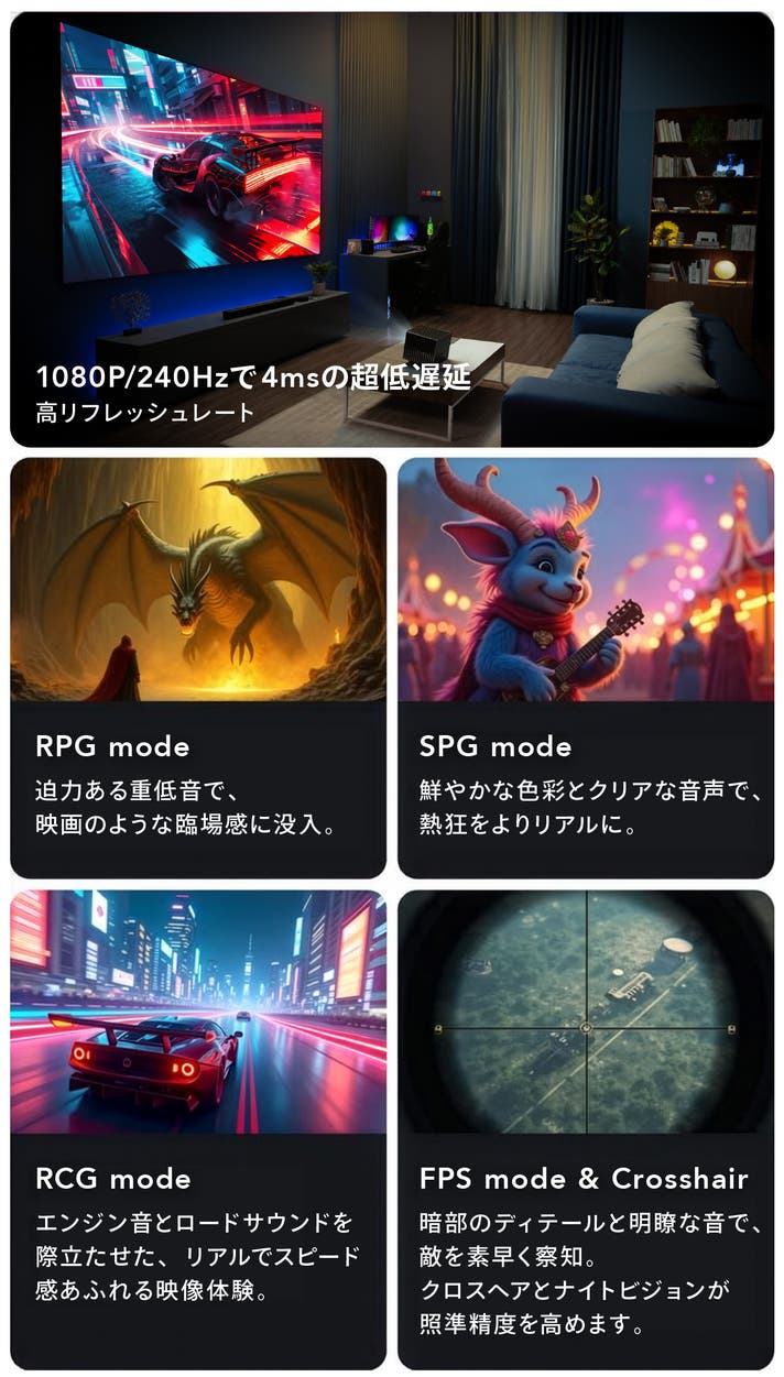 ほぼ遅延を感じさせない、超低遅延(1080P@240Hzで4ms)により、キレのある没入体験を実現。専用ゲーミングモードと強化ナイトビジョンで、戦闘・レース・FPSなどを自動選択、あらゆるジャンルで真価を発揮します。