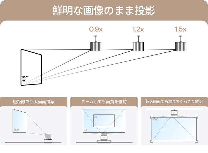 40インチ相当の小さな画面から、最大300インチ相当の屋外スクリーンまで対応。