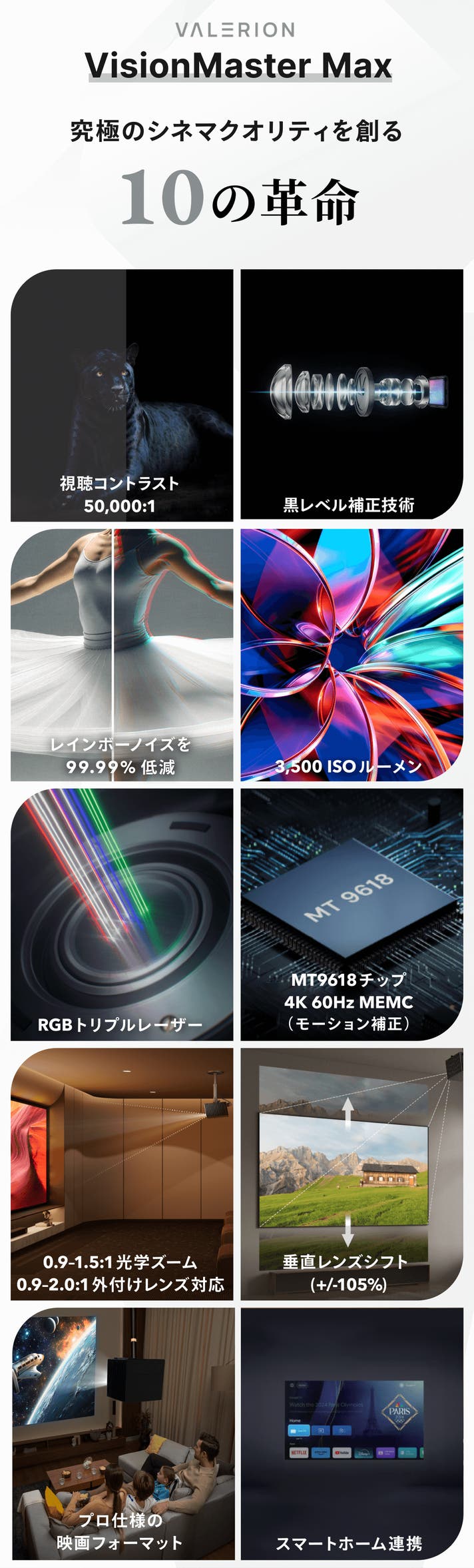 Valerion(ヴァレリオン)は、RGBレーザー技術と精密光学を極めたホームシネマプロジェクター専門ブランドです。フラッグシップモデル〈VisionMasterシリーズ〉は、プロフェッショナル機を超える映像表現で、家庭に“真のシネマクオリティ”をもたらします。深く、美しく、圧倒的な没入感――Valerionが、映像体験の新しい基準を創ります。