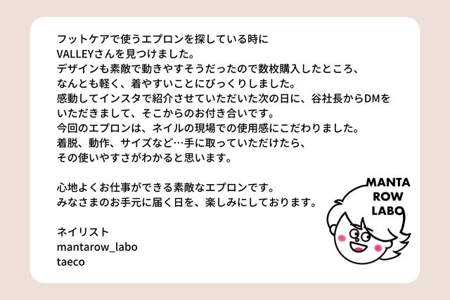 今回のエプロンは、オンラインサロン FOOTCARE研究所 by mantarow_laboにて、サロンワークのプロであるネイリストさんのたくさんのお声をいただき、誕生しました!ポイントをご紹介します!