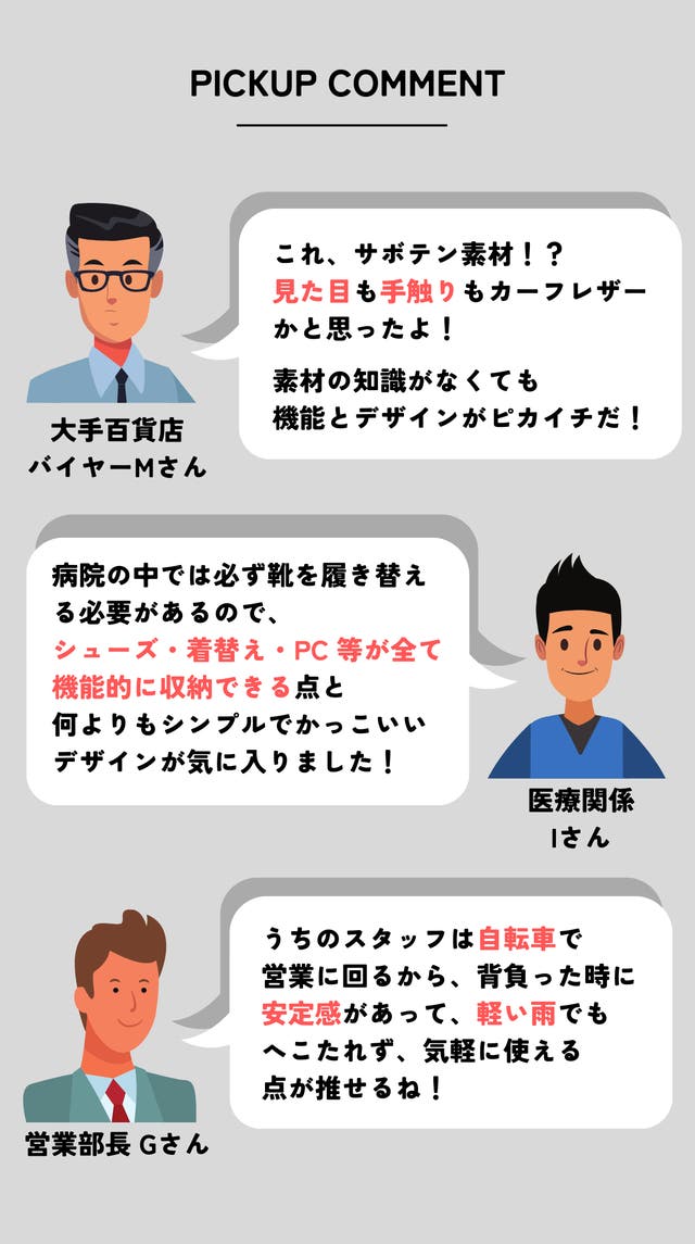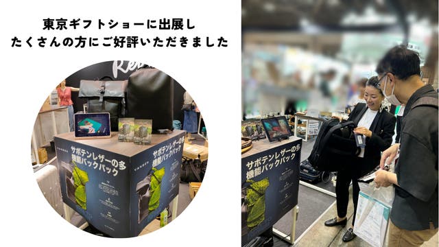 東京ギフトショーでは様々な業種の方にデザイン・機能どちらの面もほめていただきました。なめらかな手触りや、本革のような見た目なのにウォータープルーフでメンテナンスが必要のない点、靴専用のセクションがある点をほめていただけることが多かったです!