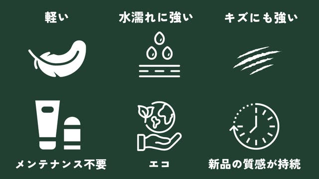 しかし、材質としては、本革と比べて軽く、雨やキズにも強く、日々のメンテナンスも不要等、たくさんの違いとメリットがあります。
