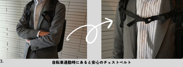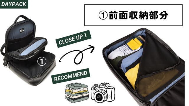 ②と③は、DAYPACKより横幅が+2cmある分、収納物の入れやすさを感じやすいかもしれません。