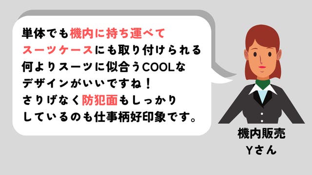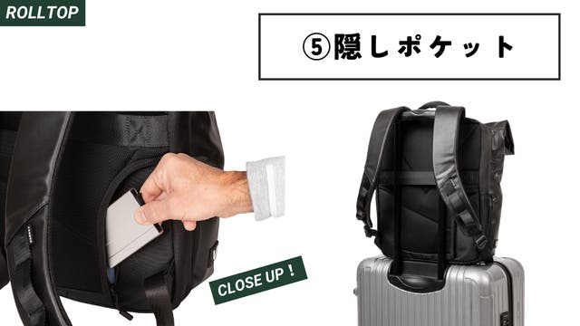 また、スーツケースのハンドル部分にベルトを取り付ければ⑤の隠しポケットにもアクセスしやすく、空港でのパスポートやチケットの出し入れもスムーズです。