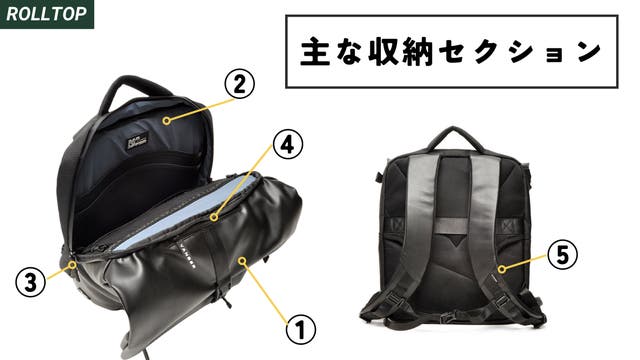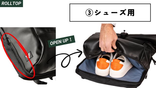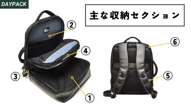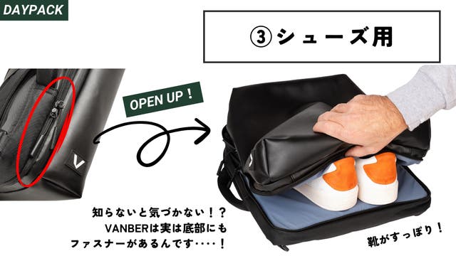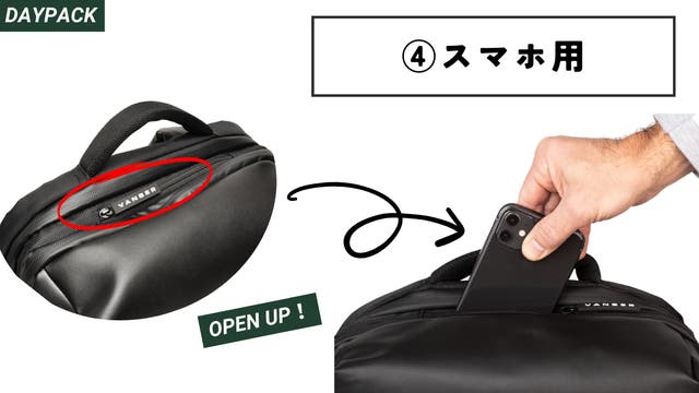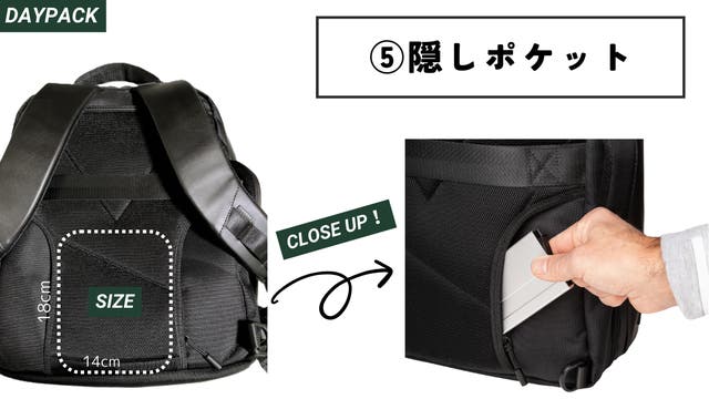 ②ビジネス・スクール用、③シューズ用、④スマホ用、⑤隠しポケットについては、DAYPACKと同じデザインです。