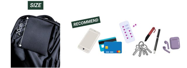 機動力抜群!前面と背面のファスナーの間にあるミニポケットは、スマホやカード、鍵、薬、イヤフォンなどの必要な時にすぐに取り出したい小物を入れておくのに重宝します。