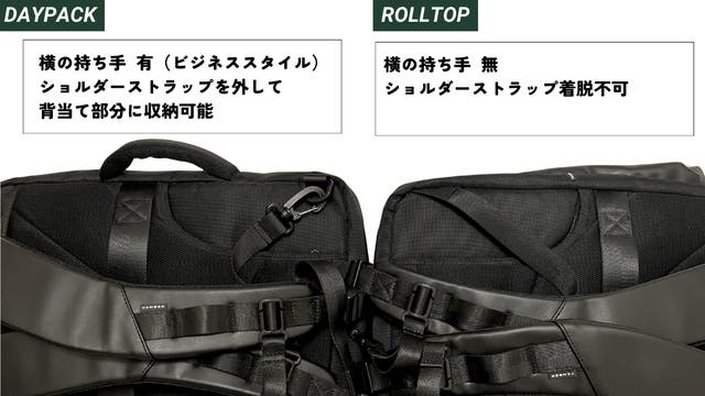 ※ショルダーストラップの取り外し及び横持ち用の取っ手がついているのはDAYPACKのみとなりますのでご注意ください。