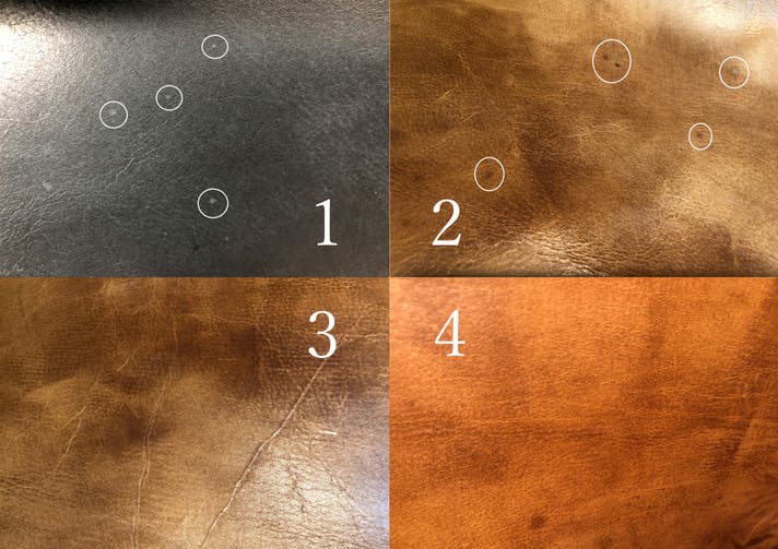 オイルをたくさん含んでビンテージの様な加工をほどこしていて、さらに染料染めで革の皮膚の質感がわかる加工になっています。