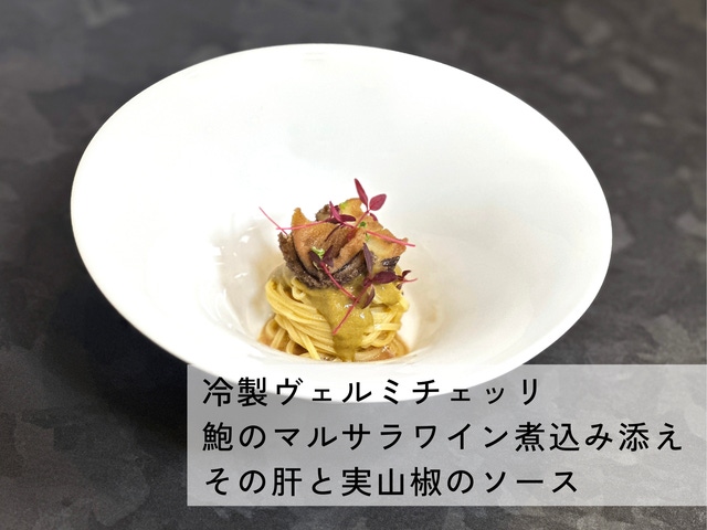 コースも中盤。ようやく見たことあるパスタが出てきたのではないでしょうか?ヴェルミチェッリはやや細麺で冷製と相性の良いパスタ。マルサラワインでじっくり煮込むことで、みりんのような甘さで旬の鮑を包み込みます。そんなまろやかな甘さのなかに実山椒が程よいアクセントとして良い役割を果たします。