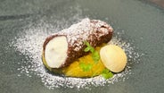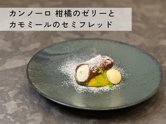 カンノーロはイタリア語で”小さな筒”を意味するシチリア島発祥のお菓子。パリッと揚げた香ばしいパスタの中にはリコッタチーズがたっぷり。濃厚なリコッタチーズと、さっぱりとした柑橘のゼリーの抜群の相性をカンノーロがさらに引き立てます。未知のパスタのコースを締め括る、爽やかな一品。