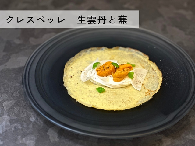 クレスペッレはご覧のようにクレープ状のパスタ。まずは眼で楽しんでいただくために、クレスペッレはあえて閉じずにご提供。最後のひと手間としてお客様に包んでいただくというシェフの遊び心もお楽しみのひとつ。お腹に溜まりすぎない生地の薄さがクレスペッレの決め手。ウニの風味とバジルの清涼感の抜群の相性をお楽しみください。