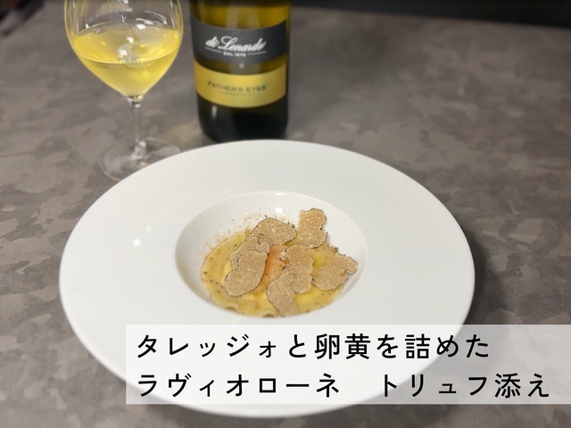 お皿の中央にまん丸と存在感のあるこのパスタはラヴィオローネ。”大きなラビオリ”とお伝えすれば、想像がつく方も多いのではないでしょうか?そんなラヴィオローネの中にタレッジォ(チーズ)と卵黄を詰めたこちらのメニューは、なんと云ってもとろける卵黄がコースの終盤をもうひと盛り上がりさせてくれます。パスタにはしっかりと火を通しつつ、卵黄には火を通しすぎない、その繊細な塩梅を想像すると、より美味しく感じられる一品です。