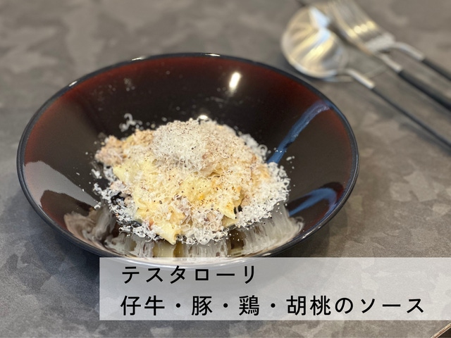 テスタローリは小麦粉と水を溶いて作った生地を一度焼いてから茹でる、イタリア最古と言われるパスタ。食感はもちもちと柔らかく、程よい食べ応え。牛乳を使ったマイルドな味わいの中に胡椒のアクセントが効いたソースには、仔牛・豚・鶏・胡桃と様々な具材が入っていて、一口一口食べるたびに新しい美味しさを楽しむことができます。