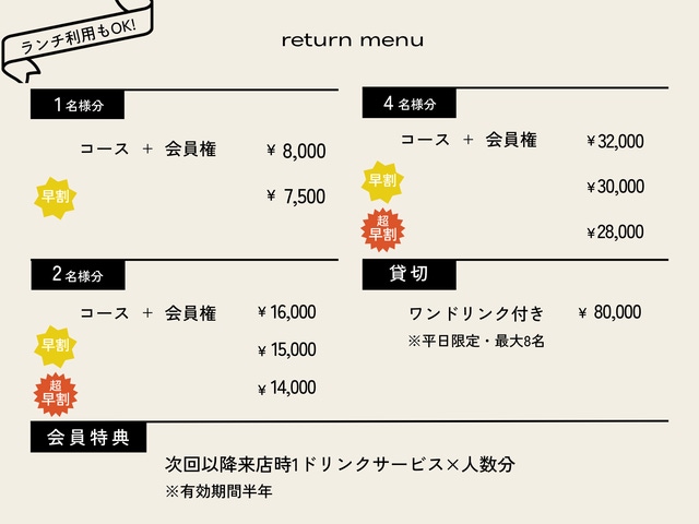 【4名様分】Makuake限定 パスタコース+限定会員権