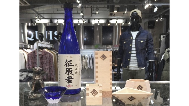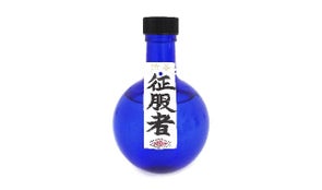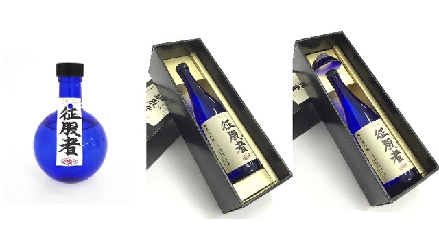 今回は、丸みを帯びた柔らかなフォルムの300mlと、凛とした堂々たる佇まいの720ml、そして720mlに経済産業大臣賞を受賞した《田島硝子》の“富士山祝盃”をセットにしたリミテッド・エディションの3種類をご用意しました。美しいブルーのガラスに張られた水切り和紙のラベルには、力強く書かれた「征服者」の文字。まさに富士山を彷彿とさせるデザインとなっています。