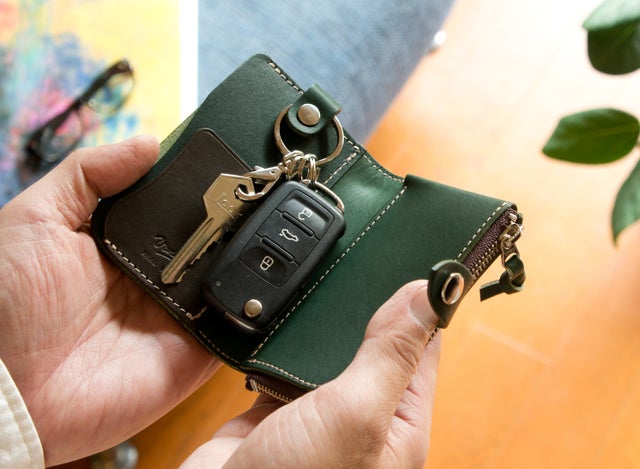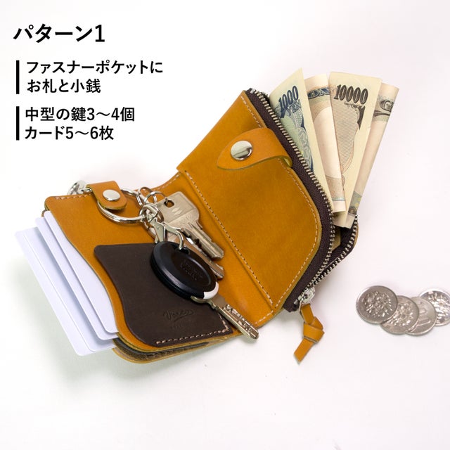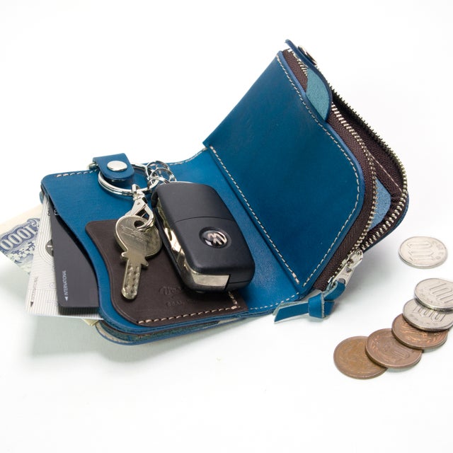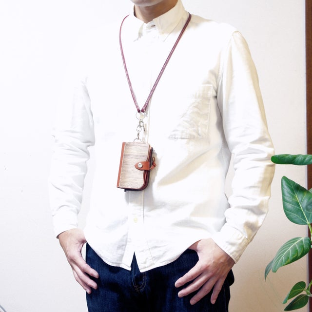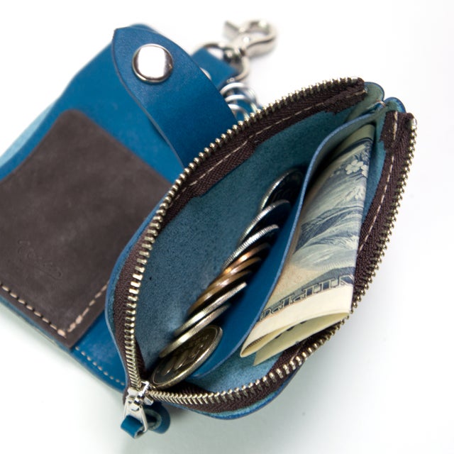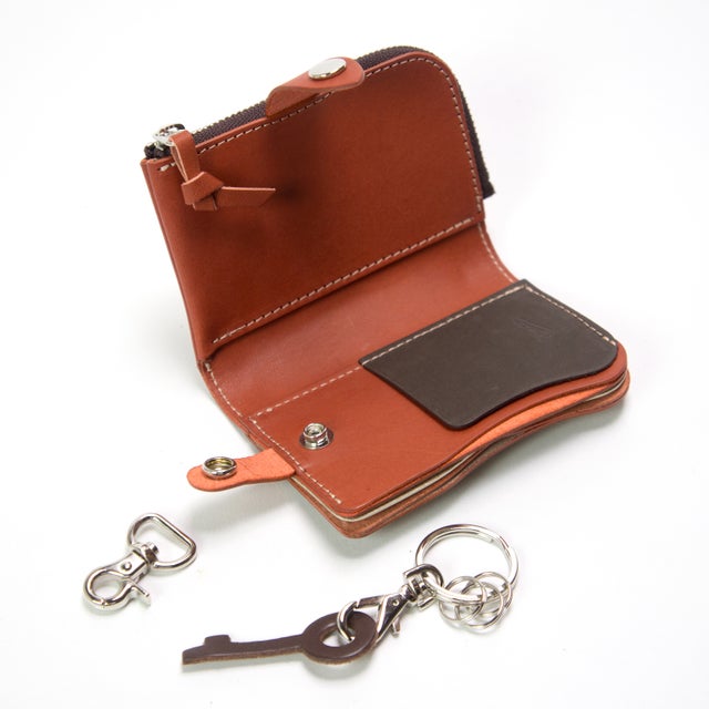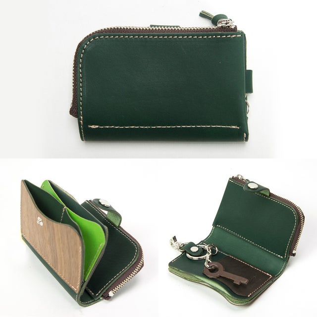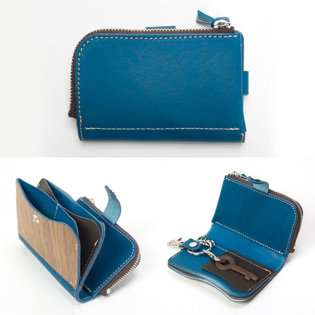 天然木と手染レザーで作られた、鍵・カード・小銭・お札が全て収納できる欲ばりなキーケース。