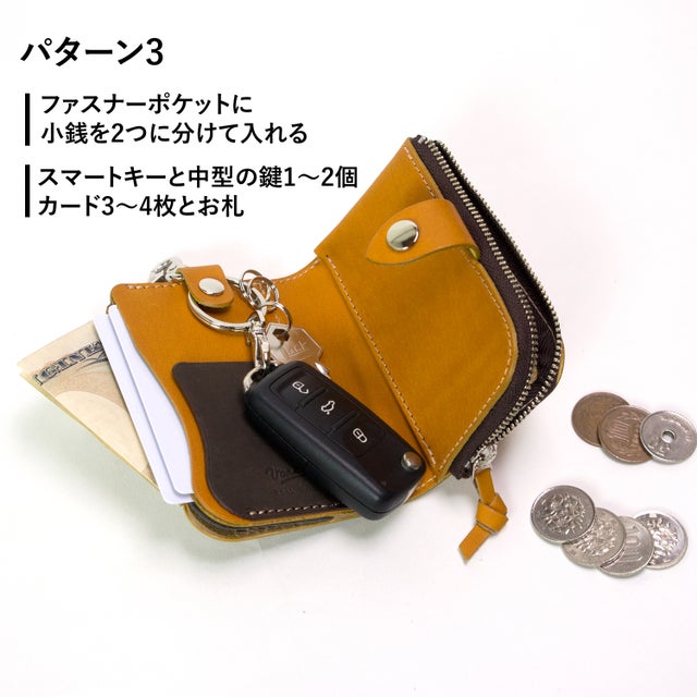 ▲ 収納例:お札2枚・カード4枚・中型サイズ鍵4本・小銭15枚