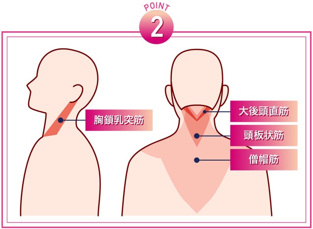 頭の位置を保つ<胸鎖乳突筋><僧帽筋>と頭と首の間を支えている<頭板状筋><大後頭直筋>という4つの筋肉の緊張や力みを軽減します。